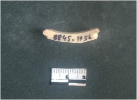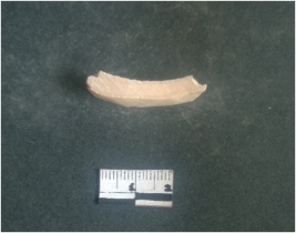 | Description / विवरण | This is a fragment of an unfinished shell circlet. It is an unfinished bangle fragment. It is white in color with polished inner surface and grounded outer surface. Rectangular in cross section. |