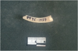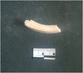 | Description / विवरण | This is a fragment of an unfinished shell circlet. It is an unfinished bangle fragment. It is white in color with polished inner surface and grounded outer surface. Rectangular in cross section. |
