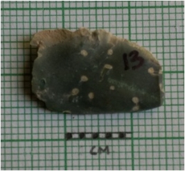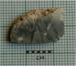 | Description / विवरण | The flake has a bulb of percussion with a backed end. The piece has some flake scars on the surface. The cryptocrystalline material has enabled smooth edged fractures and flaking of the piece. It is a part of secondary flaking activity of lithic knapping. |