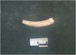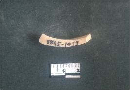 | Description / विवरण | This is a fragment of an unfinished shell circlet. It is an unfinished bangle fragment. It is white in color with polished inner surface and grounded outer surface. Rectangular in cross section. |