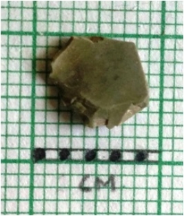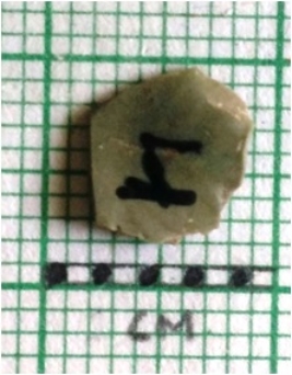 | Description / विवरण | Green chert flake is squarish in shape, with sharp edges and a shallow bulb of percussion. Flat flake. |