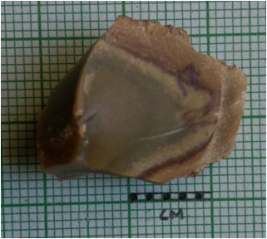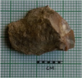 | Description / विवरण | The flake has a bulb of percussion with a backed end. The piece has some flake scars on the surface. The cryptocrystalline material has enabled smooth edged fractures and flaking of the piece. It is a part of secondary flaking activity of lithic knapping. |