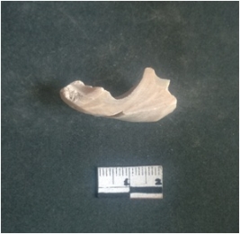 | Description / विवरण | This is a fragment of an unfinished shell circlet. It is an unfinished bangle fragment. It is white in color with polished inner surface and grounded outer surface. Rectangular in cross section. |