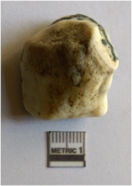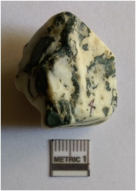 | Description / विवरण | The milky quartz piece is rounded and pointed. The piece has ferric impurities and remnants of flake scars. |