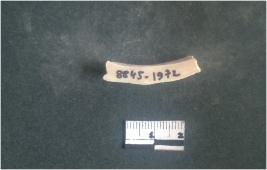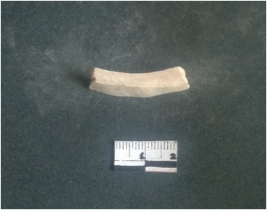 | Description / विवरण | This is a fragment of an unfinished shell circlet. It is an unfinished bangle fragment. It is white in color with polished inner surface and grounded outer surface. Rectangular in cross section. |