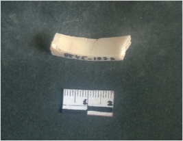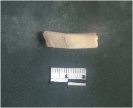 | Description / विवरण | This is a fragment of an unfinished shell circlet. It is an unfinished bangle fragment. It is white in color with polished inner surface and grounded outer surface. Rectangular in cross section. |