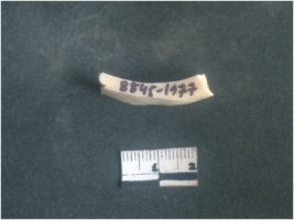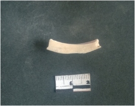 | Description / विवरण | This is a fragment of an unfinished shell circlet. It is an unfinished bangle fragment. It is white in color with polished inner surface and grounded outer surface. Rectangular in cross section. |