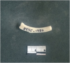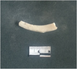 | Description / विवरण | This is a fragment of an unfinished shell circlet. It is an unfinished bangle fragment. It is white in color with polished inner surface and grounded outer surface. Rectangular in cross section. |