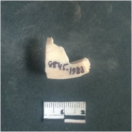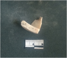| Description / विवरण | This is a fragment of an unfinished shell circlet. It is an unfinished bangle fragment. It is white in color with polished inner surface and grounded outer surface. Rectangular in cross section. |