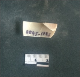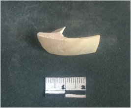 | Description / विवरण | This is a fragment of an unfinished shell circlet. It is an unfinished bangle fragment. It is white in color with polished inner surface and grounded outer surface. Rectangular in cross section. |