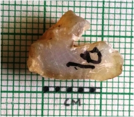 | Description / विवरण | White quartz flake with truncated flake scars on the surface and sharp edges. The piece has a flaked ridge and sharp ends as a result of flaking. |