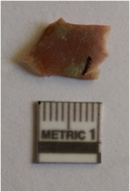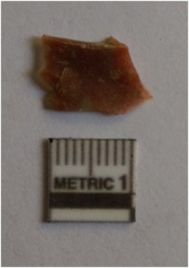 | Description / विवरण | Small jasper flake flat and with sharp edges. Flake scars on the surface. |