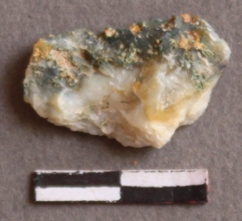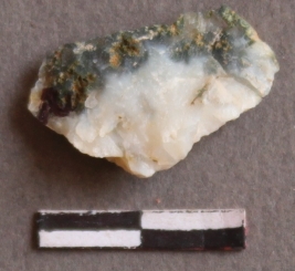 | Description / विवरण | It s a quartz fragment. Heavily patinated with copper impurities on the cortex. Cryptocrystalline in structure. |
