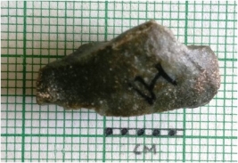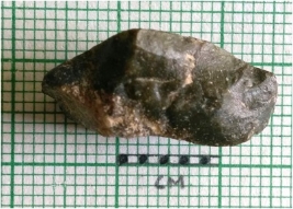 | Description / विवरण | Dark green jasper flake with median ridges and flaked edges. The flake has a shallow bulb of percussion. |