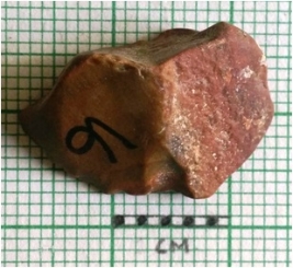 | Description / विवरण | Green chert flake is squarish in shape, with sharp edges and a shallow bulb of percussion. Flat flake. |