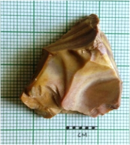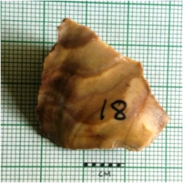 | Description / विवरण | Green chert flake is squarish in shape, with sharp edges and a shallow bulb of percussion. Flat flake. |