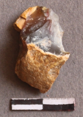 | Description / विवरण | It is a Jasper fragment. Cortex on either side of the fragment. Flake scars with ripples on the surface due to heavy percussion. |