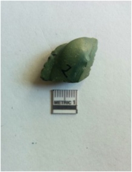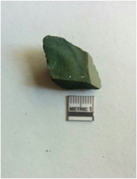 | Description / विवरण | The chert flake is roughly squarish in shape, with sharp ends and flaked surface. The piece has a prominent bulb of percussion and retouched ends. |