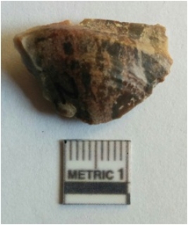 | Description / विवरण | The jasper flake has a roughly triangular shape with a positive bulb of percussion and flaring apposite sides. The piece has re - touched sides. |