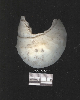 | Description / विवरण | It is an apex portion of a T. Pyrum shell. Saw cut mark on the surface. Whitish in color. Semi circular in shape. |
