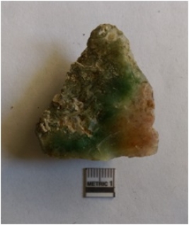 | Description / विवरण | The jasper flaked is with a heavy cortex on the dorsal side. The flaking is transverse, with some flake scars and negative bulb of percussion. |