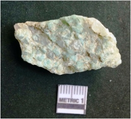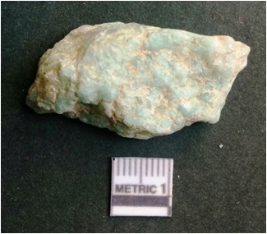 | Description / विवरण | The quartz chunk is milky white, and some cupric intrusions giving the piece a pale green color. The chunk has an elongated shape and rough edges as a result of flaking. |