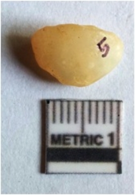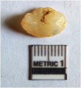 | Description / विवरण | The quartz piece is milky white with flaked edges and truncated flake has a shallow bulb of percussion as a result of flaking. |