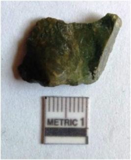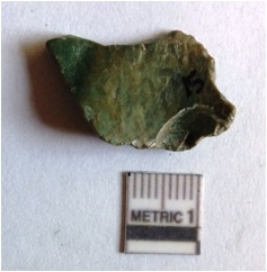 | Description / विवरण | The triangular flake is deep green in colour and has a bulb of percussion and sharp flaked ends. The edges are sharp but rounded. |
