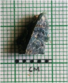 | Description / विवरण | The dark green colored flake has flaked ridges and surfacial scars. The flake has negative bulb of percussion. |