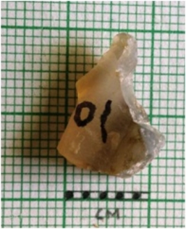 | Description / विवरण | Translucent quartz piece with a cuprous impurities, the flake is triangular in shape with a pointed end. |