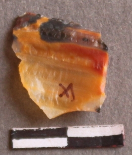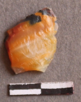 | Description / विवरण | It is a Chalcedony fragment. the cortex is patinated with ferrous impurities making it orangish in appearance. Bulb of percussion on the ventral side. Flake scars on the surface. |