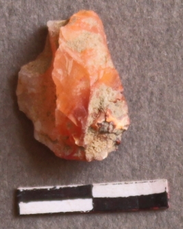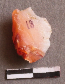 | Description / विवरण | It is a Chalcedony fragment. The cortex is patinated with ferrous impurities. Flake ridges on the surface. |
