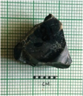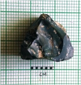 | Description / विवरण | The dark green colored flake has flaked ridges and surfacial scars. The flake has negative bulb of percussion. |
