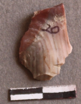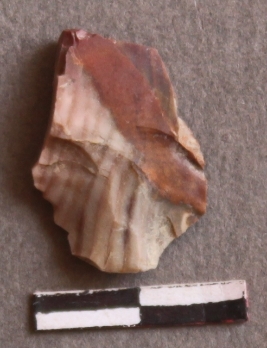 | Description / विवरण | It is a chert fragment. Bulb of percussion on the surface. Naturally formed bands appear on the surface. Flake scars on the fragment. |