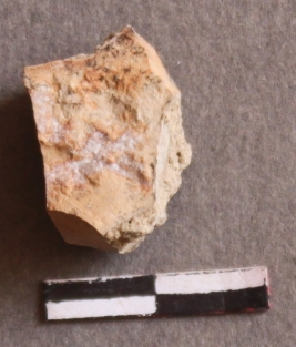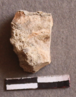 | Description / विवरण | It is a chert fragment. Badly ruptured due to weathering. Flake scars on the surface. |