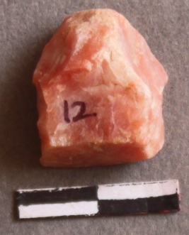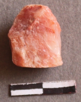 | Description / विवरण | It is a pinkish quartz fragment. Flake ridges on the surface. Cryptocrystalline in structure. |
