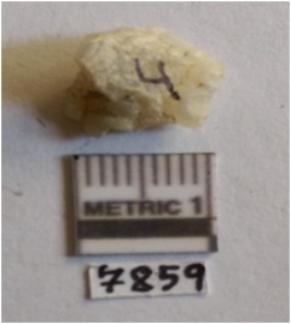 | Description / विवरण | The white quartz fragment has angular edges and flaked ends as a result of flaking. The piece is translucent in appearance and has sufacial flake scars. |