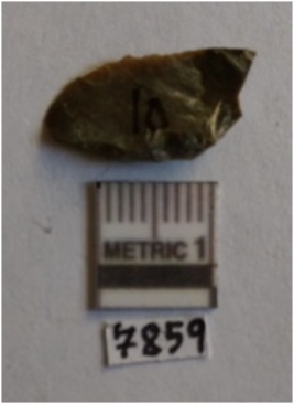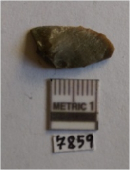 | Description / विवरण | The chert flake has a shallow bulb of percussion and sharp thin flaked edges. The piece is roughly triangular with rounded edges and thin edges. |