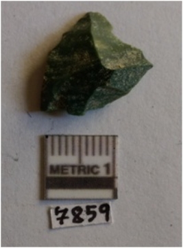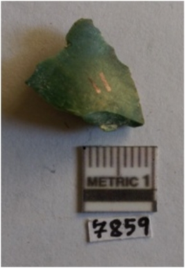| Description / विवरण | The chert flake has a shallow bulb of percussion and sharp thin flaked edges. The piece is roughly triangular with rounded edges and thin edges. |