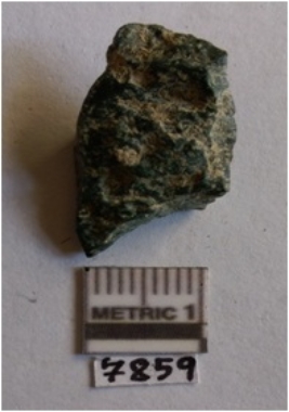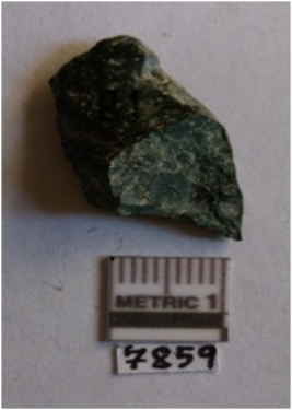 | Description / विवरण | The deep green jasper flake has flat features and surfacial flake scars. The piece has thin, sharp edges and a median bulb of percussion. The cryptocrystalline matrix of the flake gives its clear flaking appearance. |