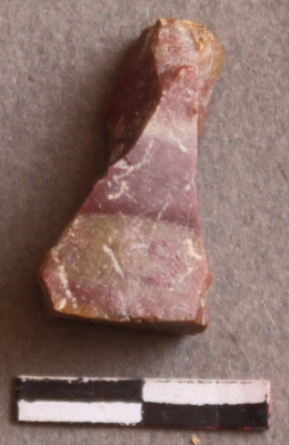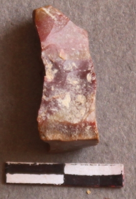 | Description / विवरण | It is a Jasper fragment. Elongated in shape. Flake scars on the surface with ripples on it due to heavy percussion. Striking platform on the proximal end. |