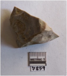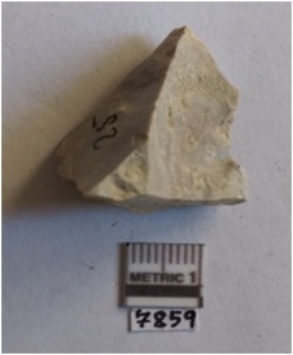 | Description / विवरण | Pale brown chert piece has surfacial flake scars and a rough triangular shape owing to flaking. |