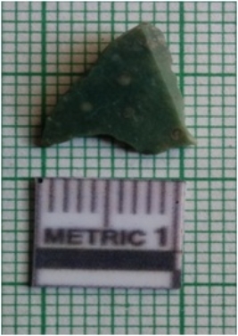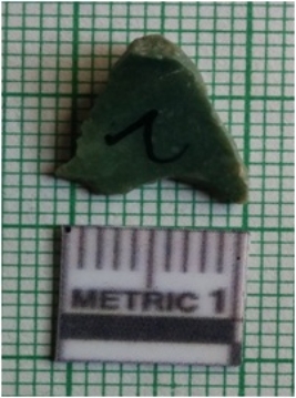 | Description / विवरण | The chert flake has a shallow bulb of percussion and sharp flaked edges. The piece has flake scars on the surface and green coloration. |