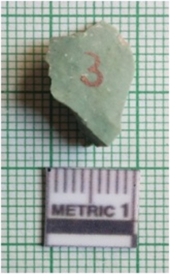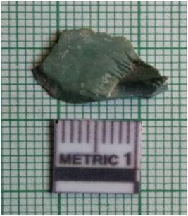 | Description / विवरण | The chert flake has a shallow bulb of percussion and sharp flaked edges. The piece has flake scars on the surface and green coloration. |
