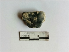 | Description / विवरण | The schist fragment has heavy encrustation on the surface, and black coloration. |