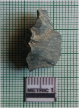 | Description / विवरण | The chert flake has a negative bulb of percussion and sharp edges as a result of flaking. The piece is however rolled with rounded appearance. |