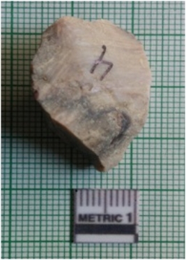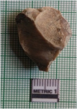 | Description / विवरण | The chert flake has a negative bulb of percussion and sharp edges as a result of flaking. The piece is however rolled with rounded appearance. |