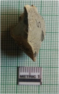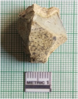 | Description / विवरण | The chert flake has a negative bulb of percussion and sharp edges as a result of flaking. The piece is however rolled with rounded appearance. |