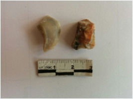 | Description / विवरण | The reddish jasper chunk has numerous flake scars on the surface. The piece has a cut side and ripple marks as a result of flaking activity. |
