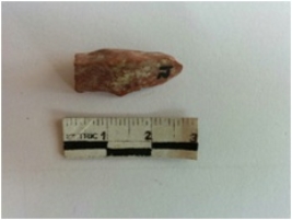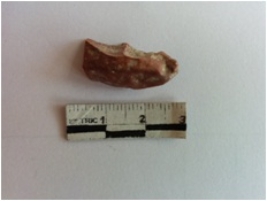 | Description / विवरण | The chert piece has a profusely flaked surface with multiple negative flake scars and retoucheds. Edges are sharp and ripple marks are visible. Red in color. |